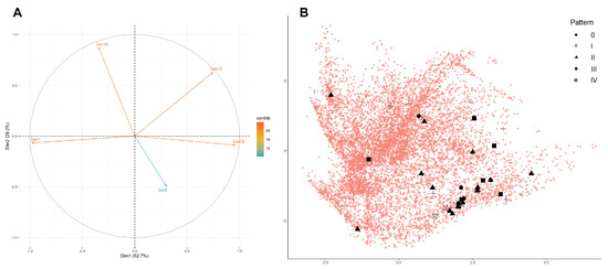 Principal component analysis of Natrix helvetica cetti in Sardinia. The first and second dimensions explain 52.7% and 28.2% of the variation observed in the data, respectively. (A) Bioclimatic variables used for defining the environmental space (warmer colours indicate higher variable contribution). (B) Occurrence records divided by dorsal pattern (black shapes) and represented in bidimensional environmental space against randomly sampled background points (red dots).
