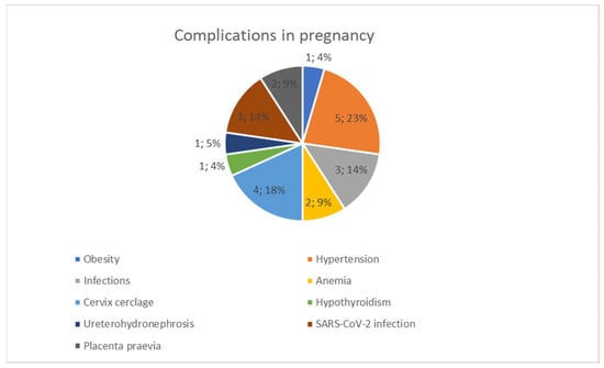 After neonatal screening in the maternity ward, over the 3-year study period, 12,206 newborns were born, of which 1250 newborns were hospitalized in the intensive care unit; 191 (1.56%) pregnancies of the total newborns (12,206) were obtained through in vitro fertilization; 1144 (9.37%) were preterm according to the case definition; we identified 14 infants with cavernous hemangioma. In our study, the prevalence of cavernous hemangioma was 0.11%. The mean age of the mothers at the time of birth was 35.07 ± 6.12 years, the minimum age being 25 years old and the maximum being 44 years old. The characteristics of the study group are presented in Table 1 and the distribution of complications in pregnancy is presented in Figure 1 (Table 1, Figure 1).