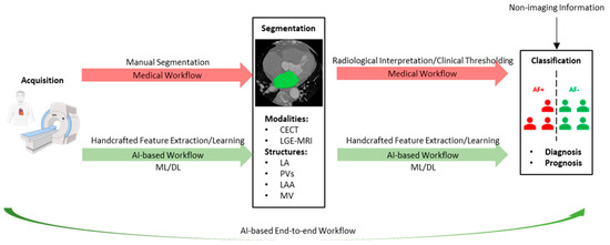 Figure 1 illustrates the two most critical steps in image-guided AF care, namely, segmentation and classification. In the medical workflow, the segmentation step is manually performed by clinical experts. Manual segmentation of the structures of interests is labor-intensive and suffers from high intra-observer and inter-observer variability. Following the segmentation step, imaging biomarkers are measured through radiological interpretation and clinical thresholding, which are subsequently used in the classification step to support the diagnosis and prognosis of AF. In the medical workflow, classification is performed using statistical approaches, such as scoring systems [9]. However, such methods are based on sparse imaging biomarkers and non-imaging information, which may result in an oversimplification of the actual scenario. Hence, in the medical workflow, intra-observer and inter-observer variability reduces the accuracy and consistency of segmentation and classification, presenting significant challenges for the diagnosis and management of AF in terms of human resources and the reliability of results.