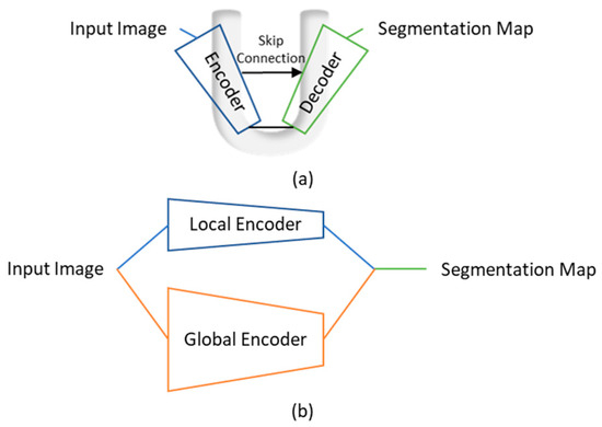 While U-net has demonstrated its effectiveness in learning local features, its single-path architecture can hinder its ability to capture larger-scale features. Xiong et al. proposed AtriaNet [24], a model with a unique dual-path architecture for LA segmentation. As illustrated in Figure 3b, AtriaNet uses a local encoder and a global encoder for feature learning at local and global scales, both centralized on small image patches. The local encoder collects detailed geometric information about the LA for each pixel within its immediate vicinity. On the other hand, the global encoder gathers information on the position and overall structure of the LA. In order to reduce the number of parameters in the global encoder, max pooling was applied in the first layer of the global encoder so that the resolution of large input images could be decreased. The learned local and global features were merged to generate the output segmentation maps for the small image patches. Du et al. [25] also adopted the concept of a dual-path structure and multiscale feature learning and proposed a segmentation model integrating dual-path modules (DPMs) and multiscale context-aware modules (MSCMs) to facilitate multiscale feature learning.