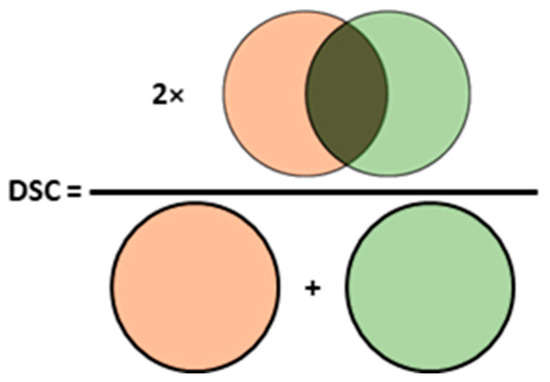 Similarity-based metrics are measured by the volume overlap between the output segmentation maps generated by the models and the ground truth segmentation maps. Besides DSC (Figure 4), which is frequently used for a comparison of the performance of segmentation models [13,43], the Jaccard similarity coefficient (JSC), which is computed as the intersection over the union of two volumes, can also be used. Both the pixel-wise and the similarity-based evaluation metrics lie within the range of [0, 1], and an increase in the metric indicates an increase in segmentation performance.