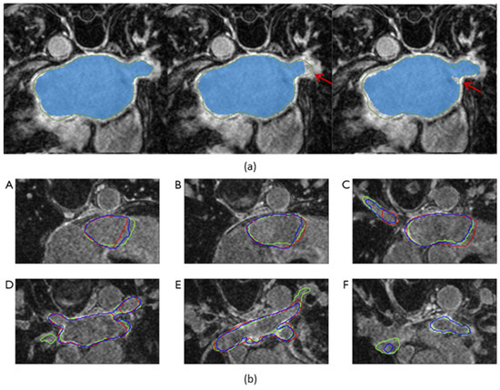 Visualization of the output segmentation maps superimposed on axial slices of late gadolinium-enhanced magnetic resonance imaging scans. (a) Comparison of the output segmentation maps. The green contours and the blue masks represent the ground truth and the model’s output segmentation maps, respectively. From left to right: the model with both the symmetric multilevel supervision (SML) structure and the uncertainty-guided loss function, the model with only the SML structure, and the model with only an auxiliary supervision branch added to the decoder. Red arrows point out disagreements between the model output and the ground truth. (b) This shows a decline in segmentation accuracy in the vicinity of the pulmonary veins. (A–F): axial slices 15%, 25%, 40%, 60%, 75%, and 85% along the longitudinal axis of the left atrium. The green, red, and blue contours represent the segmentation maps of the ground truth, 2-dimensional segmentation model, and 3-dimensional segmentation model, respectively. The 2-dimensional segmentation model completely failed on the slice 85% along the axis. Figure source: (a) [27], (b) [26].