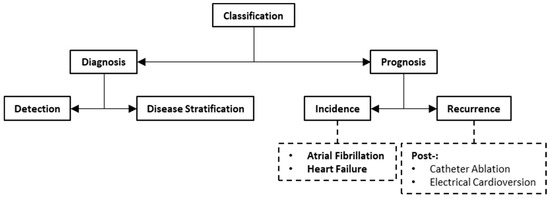 Classification involves assigning samples to one or more predefined categories based on some observed characteristics or features. These samples could be a group of patients, or the acquired images of the group of patients. The categories could represent the presence or absence of a disease, or different subtypes of a disease. A taxonomy of AI-based classification for AF is illustrated in Figure 6. We can broadly categorize classification into the diagnosis and prognosis of AF. Table 4 provides a summary of publications on AI-based classification methods for image-assisted care of AF.