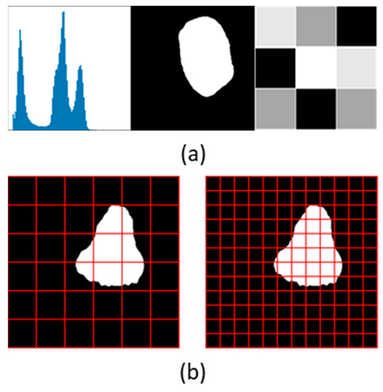 Radiomic features are high-level features that are typically not clinically recognized, nor can they be identified or evaluated with the naked eye. They are quantitative features that can be extracted from images through mathematical operations. The process of automated extraction of a large number of radiomic features is known as radiomics [62]. Radiomic features can be classified as first-order features, shape features, and texture features, as illustrated in Figure 7a. First-order features are based on the image histogram, shape features are based on the geometry of the structures studied, and texture features are based on the spatial distribution of the pixels [61]. Standardized definitions and validated reference values have been provided for a set of radiomic features [63], which can be extracted using open-source platforms, such as PyRadiomics [64] and QMaZda [65]. Radiomic features can be based on the fractal dimension of object structures, which provides a quantitative measure of their roughness [66]. An example of such a feature is the variation in the ratio of fractal dimension as the image resolution decreases, which is determined by the number of cells of different sizes needed to cover the boundary of the structure, as illustrated in Figure 7b.