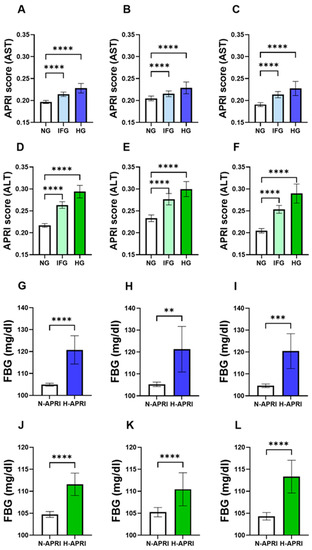Changes in the APRI score levels in light of FBG. Means ± 95% CI of the AST APRI score of subjects with NG, IFG and HG in (A) both genders, (B) males and (C) females. Means ± 95% CI of the ALT APRI score of subjects with NG, IFG and HG in (D) both genders, (E) males and (F) females. Means ± 95% CI of FBG concentrations in the normal AST APRI score (N-APRI) and high AST APRI score (H-APRI) groups in (G) both genders, (H) males and (I) females. Means ± 95% CI of FBG concentrations in the normal ALT APRI score (N-APRI) and high ALT APRI score (H-APRI) groups in (J) both genders, (K) males and (L) females. ** p < 0.01, *** p < 0.001 and **** p < 0.0001.