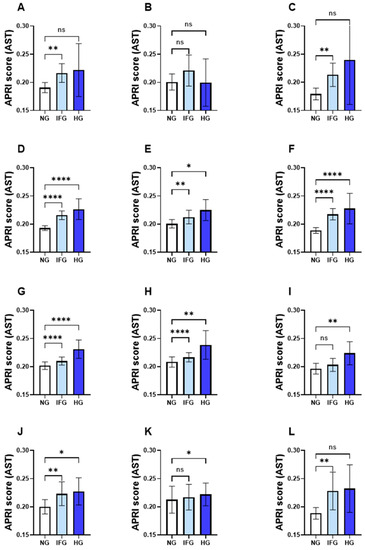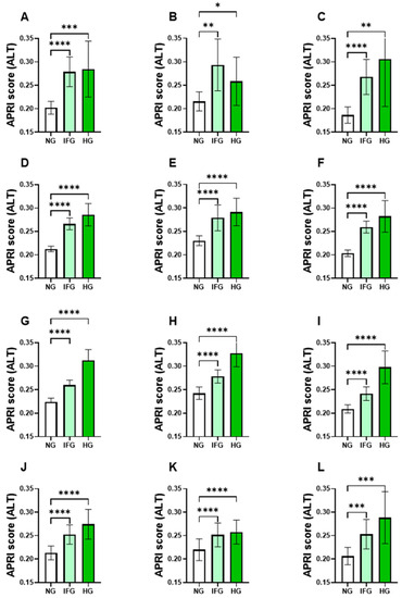 Stratification of subjects based on FBG concentrations permitted the APRI score to distinguish IFG and HG from NG. In particular, the values of the AST APRI score were increased by approximately 8% and 15% in IFG and HG, respectively, compared to those of the NG control group, while the ALT APRI score values were elevated by 22% and 36% in IFG and HG, respectively, compared to those of the NG control group. The ability of the APRI score to discriminate IFG from NG suggests that the APRI score may be a sensitive marker of glucose disturbances. In a population of 1225 subjects, Matteis et al. demonstrated that the APRI score is elevated in prediabetics and significantly correlated with cardiovascular risk in non-metabolic and metabolic subjects [28]. Another report showed that the APRI score was high among those with worse glycemia, and a high APRI score was able to predict the development of diabetes [30].