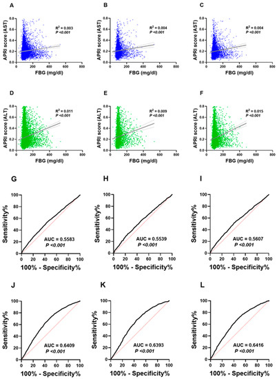 Association of the APRI score and FBG. Simple linear regression of the association between the AST APRI score and FBG concentration (A) in both genders, (B) in males and (C) in females. Simple linear regression of the association between the ALT APRI score and FBG concentration (D) in both genders, (E) in males and (F) in females. ROC curves of the AST APRI score and FBG concentration (G) in both genders, (H) in males and (I) in females. ROC curves of the ALT APRI score and FBG concentration (J) in both genders, (K) in males and (L) in females.
