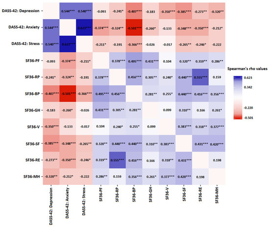 Heatmap correlation matrix presenting associations between The Depression Anxiety Stress Scale (DASS-42) and 36-Item Short Form Health Survey questionnaire (SF-36) domains. PF-physical functioning, RP-role physical, BP-bodily pain, GH-general health, V-vitality, SF-social functioning, RE-role emotional, MH-mental health; * p < 0.05; ** p < 0.01; *** p < 0.001. The colors used in the heatmap are designed to convey specific information about the correlations: red indicates a negative correlation, blue represents a positive correlation between two variables, while the color intensity (both red and blue) reflects the magnitude of the correlation coefficient. A stronger correlation, whether positive or negative, is depicted by a darker and more saturated color, while weaker correlations are shown with lighter shades.