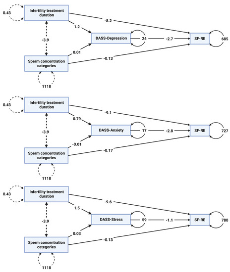 Individually constructed mediation models for depression, anxiety, and stress (as presented in Figure 2) entailed estimations of both direct and indirect effects. The mediation model pertaining to the DASS-Anxiety symptom cluster indicated a statistically significant direct effect of both the sperm concentration grouping (p = 0.034) and the time-extent of the infertility treatment (p = 0.037) based on SF-RE, while significant indirect effects were observed only for the treatment duration entity (p = 0.244, p = 0.033, respectively). The mediation model for DASS-Depression yielded less-convincing results, with direct effects demonstrating marginal significance for sperm concentration categories (p = 0.05) and no significant effects for the treatment duration (p = 0.123). Additionally, the model did not reveal any significant indirect effects (p = 0.154, p = 0.431, respectively). Similarly, the mediation model for the DASS-Stress cluster yielded results with only the direct effects of statistically significant levels for the sperm concentration class (p = 0.032). The direct effects for the infertility period, as well as indirect, i.e., mediation effects, were all bellow the statistical significance threshold. Total effects of the sperm concentration category and infertility duration based on SF-RE were both significant (p = 0.015, p = 0.032, respectively). This implies that SF-RE is directly affected by the explored infertility parameters and that the effect of the treatment duration is partially mediated by socioemotional distress expressed in the form of anxiety.