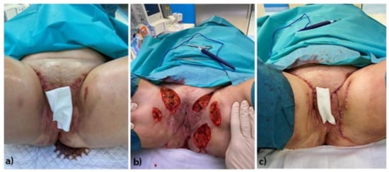 Stages of surgical treatment of a female patient with HS located on anogenital regions: (a) Preoperative clinical condition of the patient (pre-op), (b) Intraoperative clinical condition of the patient. (c) postoperative clinical condition of the patient. Legend: HS—hidradenitis syppurativa, pre-op—preoperative.