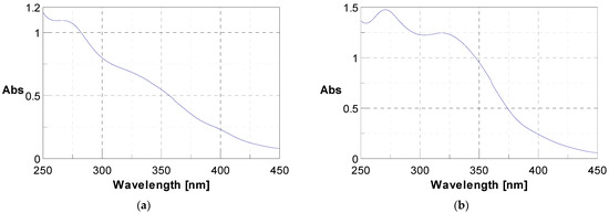 UV-vis spectra showing the presence of polyphenols at 280 nm (a) and flavonoids at 340 nm (b).