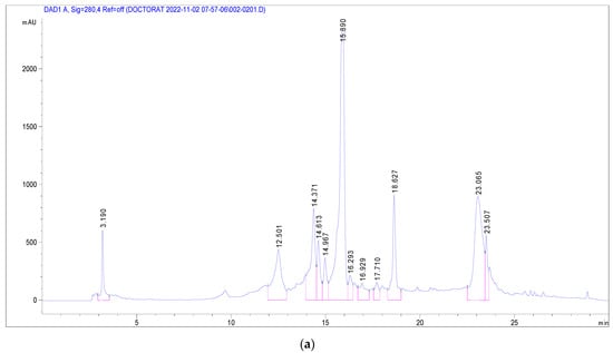 The extraction solvents used, as well as specific chemical reagents, included PBS, Na2CO3 ≥ 99.5% (Cas No.497-19-8), AlCl3, Folin–Ciocalteu (Cat. No 109001), ferric chloride (Cas No.7705-08-0), potassium acetate, quercetin (Cas No.117-39-5), gallic acid (Cas No. 149-91-7), vanillin (Cas No. 121-33-5), sulfuric acid, hydrochloric acid (HCl), sodium phosphate, ammonium molybdate, and DPPH (2,2-diphenyl-1-picrylhydrazyl, Cas No. 1898-66-4), (Sigma-Aldrich, St. Louis, MO, USA). HPLC-grade solvents were procured from Merck (Darmstadt, Germany). Water purification was carried out using the Direct-Q UV system from Millipore, (St. Louis, MO, USA). High-purity standard compounds were used for HPLC, specifically, gallic acid, chlorogenic acid (with 99% HPLC purity), and rutin (with 99% HPLC purity) (Sigma, St. Louis, MO, USA). Various culture mediums were used, including nutrient broth, Baird-Parker agar, TBX agar, XLD agar, Palcam agar, and Muller Hinton agar (Oxoid Ltd., Basingstoke, Hampshire, UK). All chemicals and reagents used in this study met analytical grade standards.