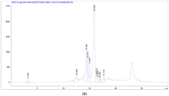 Chromatographic profile at 280 nm (a) and 340 nm (b) of J. multifida methanolic extract in electrospray positive ionization mode.