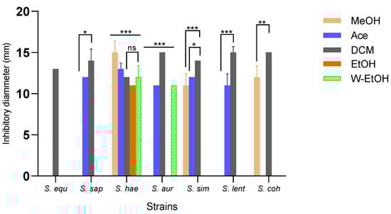 Medium inhibitory diameter zone of J. multifida leaf extracts on meat-isolated Staphylococcus strains. MeOH: Methanol, Ace: Acetone; DCM: Dichlorometane; EtOH: Ethanol; W-EtOH: Water-Ethanol; S. equ: Staphylococcus equorum; S. sap: Staphylococcus saprophyticus; S. hae: Staphylococcus haemolyticus; S. aur: Staphylococcus aureus; S. sim: Staphylococcus simulans; S. len: Staphylococcus lentus; S. coh: Staphylococcus cohnii. *: p < 0.05; **: p < 0.01; ***: p < 0.001; ns: p > 0.05.