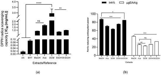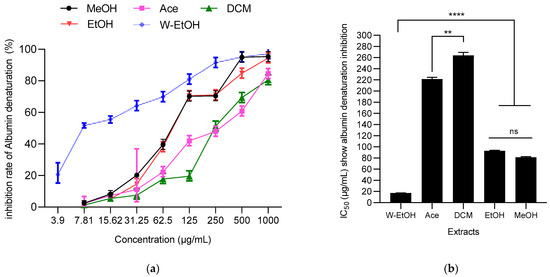 J. multifida extracts’ inhibition rate of albumin denaturation (a) and their IC50 (b). MeOH: Methanol, Ace: Acetone; DCM: Dichlorometane; EtOH: Ethanol; W-EtOH: Water-Ethanol; **: p < 0.01; ****: p = 0.0001; ns: p > 0.05.
