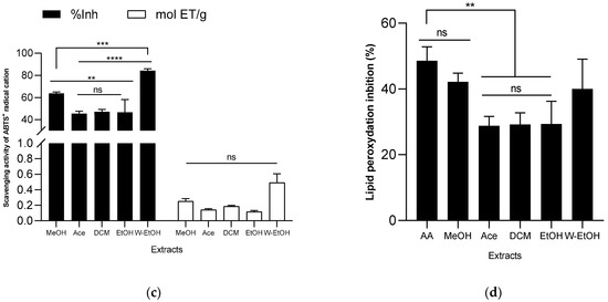 When examining the ABTS radical cation inhibition capacity (refer to Figure 5c), the activity (expressed as inhibition percentage) of the extracts decreased in the following sequence: acetone (45.49 ± 2.10%) < ethanol (46.58 ± 11.59%) < dichloromethane (47.15 ± 2.02%) < methanol (63.78 ± 1.16%) < water-ethanol (84.26 ± 1.68%). Notably, when using the ABTS method, the water-ethanolic extract demonstrated a higher reducing power (0.49 ± 0.11 mol ET/g) compared to the methanolic extract (0.25 ± 0.03 mol ET/g), which is a deviation from the results seen with the FRAP method. In the lipid peroxidation assay, the methanolic extract displayed the highest inhibition rate (42.19 ± 2.60%), closely followed by the water-ethanolic extract (40.00 ± 9.07%). There was no significant difference (p > 0.05) between these two extracts and the potency of ascorbic acid (used as a reference), which exhibited an inhibition rate of 48.59 ± 4.21%. Among all, the acetone extract showed the lowest inhibition rate at 28.80 ± 2.89%. When compared to certain extracts, ascorbic acid significantly outperformed the acetone extract (p = 0.0019), dichloromethane (p = 0.0024), and ethanol extract (p = 0.0026) in lipid peroxidation inhibition.