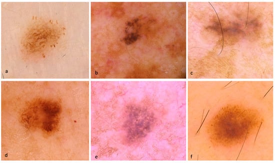 Dermoscopic images of SDMs. (a) in-situ SDM with patchy peripheral atypical pigment network, tan structureless areas, and multiple small hyperpigmented areas. (b) in-situ SDM with atypical pigment network and atypical globules (c) invasive SDM (Breslow thickness of 0.2 mm) with polymorphous vessels. (d) in-situ SDM with negative network, atypical globules, targetoid dots, and brown circles. (e) in-situ SDM with atypical network and brown circles. (f) in-situ SDM with atypical globules and hyperpigmented blotches around the hair follicle.