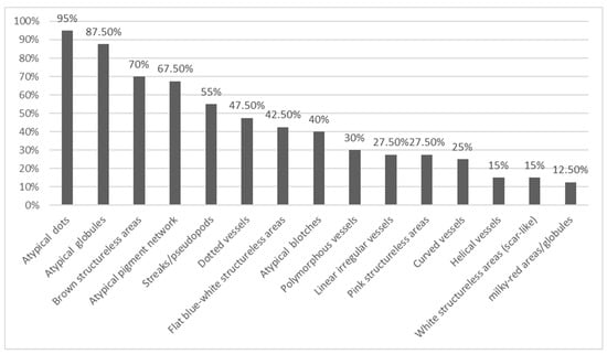 A comprehensive evaluation of dermoscopic features, including melanoma-specific characteristics, was conducted. Notably, the most prevalent dermoscopic features were irregular dots and globules (95 and 87.5%, respectively). Structureless brown areas were also commonly observed, accounting for 70% of cases. Additionally, atypical network was detected in 67.5% of lesions. Atypical streaks/pseudopods were evident in 55% of cases, while 42.5% displayed distinctive flat structureless blue-white areas. Irregular blotches, as off-centered hyperpigmented areas, were observed in 40% of cases. Regression/scar-like depigmentation, granularity (peppering), angulated lines, and shiny white structures were dermoscopic features less frequently encountered. Moreover, dotted vessels were identified in 47.5% of cases, with 30% displaying polymorphous vessels. For a more comprehensive visualization of the distribution of dermoscopic features, Figure 3 visually represents their prevalence.