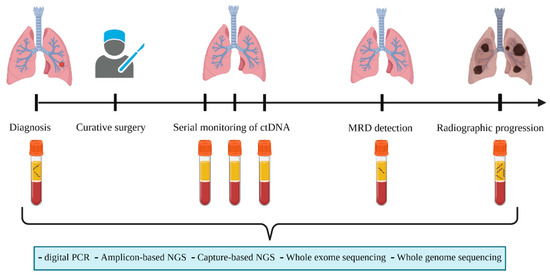 Schematic representation of serial monitoring of ctDNA during follow up in patients with early-stage non-small cell lung cancer for minimal residual disease detection before radiographic progression. The figure was created with BioRender (www.biorender.com, accessed on 1 June 2023).