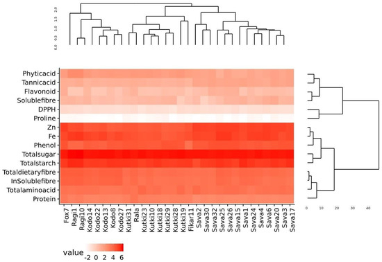 Millets are high in protein, fatty acids, vitamins, minerals, dietary fiber and polyphenols, which are all vital elements [35]. The use of millets as a food supplement for increasing nutritional security and livelihoods has been documented in several studies [36,37]. Understanding the nutritional and antinutritional value of millets is critical for designing value-added goods. The current study compares the nutritional and antinutritional characteristics of thirty millet genotypes belonging of different classes that were gathered locally.