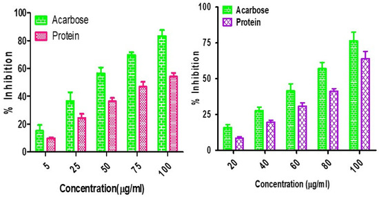 To assay α-amylase activity, the method suggested by Yu et al. [32] was employed. A 0.02 M phosphate buffer at pH 6.9 containing the α-amylase enzyme (2.5 U/mL) was pre-incubated with seeds for 10 min at 25 °C and was mixed with 1% starch in 0.02 M phosphate buffer along with 2.0 mL of 0.1 M 3, 5-dinitrosalicylic acid (DNSA). The absorbance was recorded at a 540 nm wavelength.