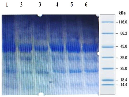 Sodium dodecyl sulfate polyacrylamide gel electrophoresis (SDS-PAGE): millet seed protein profiling was performed by using SDS-PAGE as per the method recommended by Laemmli [33]. Seed powder (25 mg) was dissolved in 1.0 mL sample buffer (0.5 M Tris-HCI pH 6.8). It was vortexed for 30 min at 5000 rpm and then centrifuged for 30 min at 5000× g rpm. The supernatant containing the protein was transferred to another tube. After combining 10–20 μL of the protein sample with protein dyes (SDS, glycerol, bromophenol blue and DTT), the mixture was placed in boiling water for 5–10 min. Next, the mixture was introduced onto a vertical electrophoresis apparatus at 100 V for 1.5–2 h with a 12% running gel and a 5% stacking gel. A standard protein ladder (PageRuler™ Plus Pre-stained Protein Ladder), containing 10 to 250 kDa markers, was loaded as a standard for molecular weight estimation. A staining solution, i.e., Coomassie brilliant blue R-250, was employed to visualize gels by incubating the gels in the stain for 1–2 h or overnight. The stained gels were de-stained by changing the fixing solution 1:4:5 (glacial acetic acid, distilled water, methanol) until the excess stain disappeared.