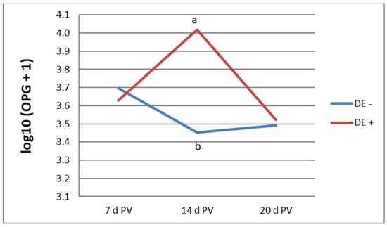 Oocyst output in the vaccinated groups [log10 (OPG + 1)]; a, b—mean values not sharing a common letter are significantly different (p ≤ 0.05); OPG—oocysts per gram, pv—postvaccination, and DE—dandelion extract.