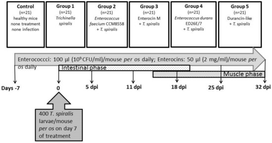 There were six groups of animals in the experiment (Figure 1): Control (n = 21)—no treatment and no infection; Group 1 (n = 21)—T. spiralis infection, no treatment; Group 2 (n = 21)—E. faecium CCM8558 + T. spiralis; Group 3 (n = 21)—enterocin M + T. spiralis; Group 4 (n = 21)—E. durans ED26E/7 + T. spiralis; Group 5 (n = 21)—durancin-like + T. spiralis. Enterococcus strains (109 CFU/mL in 100 µL) and enterocins (50 µL) were administered daily per os. Mice were challenged with 400 T. spiralis larvae (reference isolate T. spiralis ISS 004, maintained at our institute) on the 7th day of treatment. Samples of blood and tissues (the small intestines, muscles) were obtained from mice (3 mice per group) prior to infection: days −7 and 0 and post-infection: 5, 11, 18, 25, and 32 dpi.