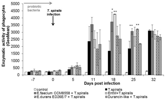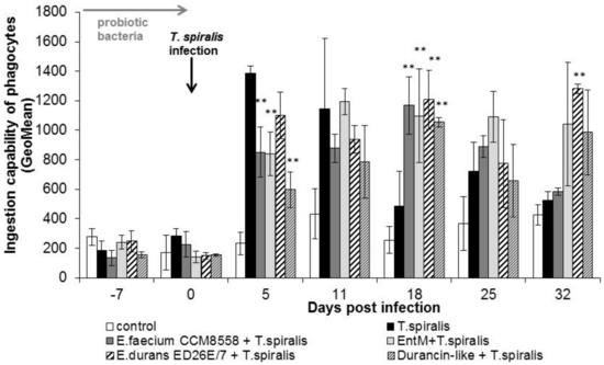 In our study, parasitic infection with T. spiralis during the first week of infection did not change the percentage of phagocytic cells but significantly increased the individual ingestion capacity of phagocytes up to 11 dpi. However, on this day, the phagocytic activity significantly decreased, and a reduction was noted in the population of blood phagocytes in untreated-infected mice until the end of the experiment. Application of enterococci (E. faecium CCM8558, E. durans ED26E/7) and the durancin-like enterocin increased the number of phagocytes at 11 dpi. and both enterococcal strains and enterocins (enterocin M and durancin-like) stimulated the ingestion capacity of phagocytes during the migratory and muscular phases of infection (from 18 to 32 dpi). A similar stimulatory effect of enterococci on blood phagocytes was noted in another study [21].