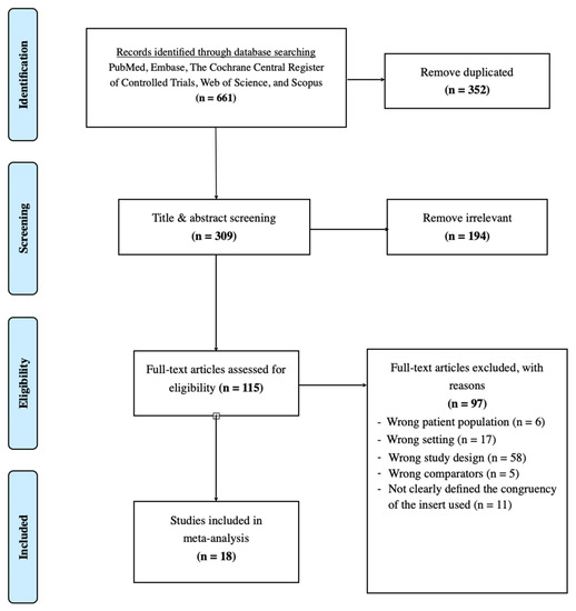 Our literature search identified a total of 661 articles through database searching. After removing duplicates and screening the titles and abstracts, 194 full-text articles were reviewed for eligibility. Ultimately, 18 studies were included in the network meta-analysis. The selection process is summarized in Figure 1.