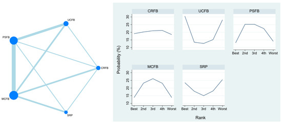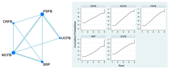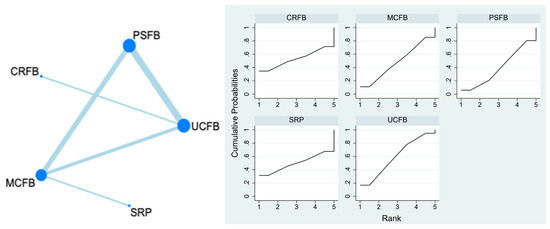 This outcome was reported by 13 studies with 1651 participants. The mean ROM of UCFB was 111.63°. UCFB was ranked the best among all the treatments for the outcome of range of motion, with the heterogeneity between groups not reaching statistical significance. The SUCRA plot is in Figure 4. The detailed numbers are presented in Appendix A(C,H).