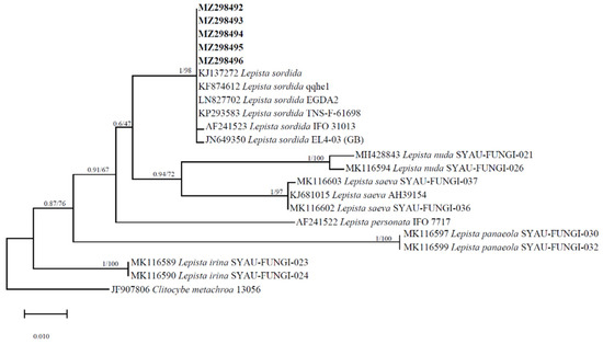 The molecular phylogenetic tree of the ITS regions of Lepista sordida as evinced by maximum likelihood and Bayesian analyses. The support values are given at the branches. The bar represents the number of expected substitutions per position.