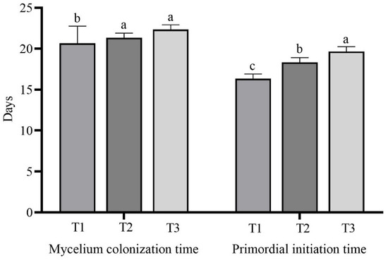 The number of days for the mycelia of L. sordida to colonize different treatment substrates and initiate primordia is shown in Figure 3 and Table S1. The mycelial colonization time of the T1 treatment with 56% rice straw, the T2 treatment with 56% corncob, and the T3 treatment with 56% soybean straw was 20.67 ± 2.08 d, 21.33 ± 0.58 d, and 22.33 ± 0.58 d, respectively. The mycelia in T1 treatment colonized the substrate substantially more quickly than the T2 and T3 treatments, which did not differ significantly from each other. The mycelia took the longest time to colonize the substrate in the T3 treatment that contained 56% soybean straw. There was a 6 d delay compared with the T1 treatment with 56% rice straw.
