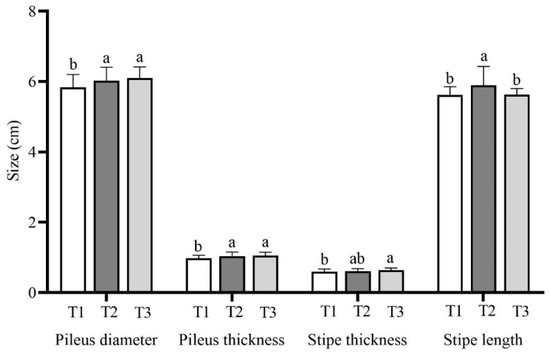 Fruiting body morphology of Lepista sordida mushrooms grown on different substrates. The means ± SD are shown. Different case letters above each bar represent significant differences (α = 0.05, ANOVA, LSD test). T1: 56% rice straw, 40% cow dung, 2% lime, 1% gypsum, and 1% calcium superphosphate; T2: 56% corncob, 40% cow dung, 2% lime, 1% gypsum, and 1% calcium superphosphate; T3: 56% soybean straw, 40% cow dung, 2% lime, 1% gypsum, and 1% calcium superphosphate. ANOVA, one-way analysis of variance; LSD, least significant difference.