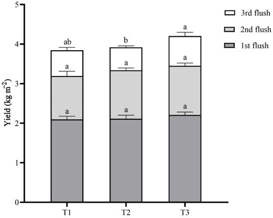 Accumulative bar diagram of the yield distribution. Different case letters above each bar represent significant differences (α = 0.05, ANOVA, LSD test). T1: 56% rice straw, 40% cow dung, 2% lime, 1% gypsum, and 1% calcium superphosphate; T2: 56% corncob, 40% cow dung, 2% lime, 1% gypsum, and 1% calcium superphosphate; T3: 56% soybean straw, 40% cow dung, 2% lime, 1% gypsum, and 1% calcium superphosphate. ANOVA, one-way analysis of variance; LSD, least significant difference.