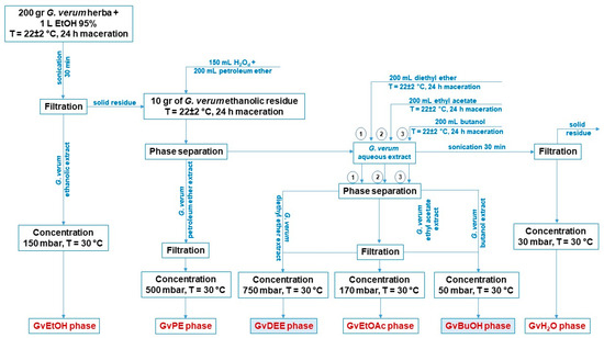 The aqueous phase was further filtered and then concentrated at 30 mbar and 30 °C; thus, the GvH2O phase was obtained. All the phases obtained were kept in a refrigerator at 4 °C until further use (characterization and biological assessment). The schematic protocol of the phases obtained is outlined in Figure 1.