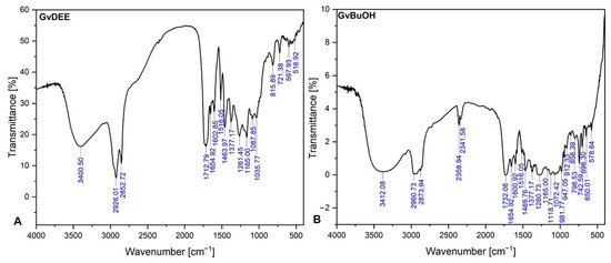 As one can observe from Figure 2 and Table 1, the two extracts (GvDEE and GvBuOH) exhibit absorption bands at similar wavenumbers meaning that specific organic functional groups are present in both extracts, with a few exceptions: the GvBuOH exhibits a doublet-like absorption band at approximately 2300 cm−1, which corresponds to the O=C=O stretching functional group from carbon dioxide. Moreover, the same extracts showed at 1118.71 cm−1 wavenumber an absorption band which can be attributed to the C–O stretching functional groups from aliphatic ethers or secondary alcohols. Another difference found in the GvBuOH extract was the appearance of multiple bands registered between 912.33 and 981.77 cm−1, which can correspond to the =C–H bending functional groups from alkenes or to the C=C bending monosubstituted functional groups from alkanes (the band recorded at 981.77 cm−1). The absorption bands recorded at 650.01 cm−1 and 696.30 cm−1 are present only in the GvBuOH extract and not the GvDEE extract. The first band corresponds to the C–Br stretching functional groups from halo compounds and the second band (696.30 cm−1) corresponds to either the =C–H bending functional groups from alkenes or to the C=C bending functional groups, disubstituted from the cis position of the alkenes present in the butanol extract (GvBuOH).