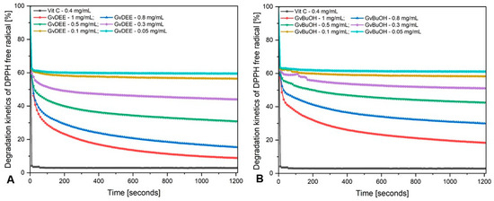 The degradation kinetics of DPPH free radicals during the period of the evaluation, given by the two extracts are quite different. The GvDEE extract indicates an 8% DPPH free radical degradation at the highest tested concentration (1 mg/mL) as compared with the GvBuOH extract, which indicates approximately 12% degradation, after 20 min of incubation. It is observed that the samples with higher concentrations (1 mg/mL and 0.8 mg/mL) almost quench the DPPH free radicals throughout the evaluation interval, with the reaction reaching equilibrium only after 1000 s. Regarding the samples of 0.5 mg/mL and 0.3 mg/mL concentration, the reaction reaches the equilibrium after 800 s, and the samples with the smallest concentration tested (0.1 mg/mL and 0.05 mg/mL) quench the DPPH free radicals in the first 200 s; subsequently, the reaction reaches equilibrium. In the case of the 0.3 mg/mL concentration of the GvBuOH extract, one can observe some fluctuations in the degradation kinetics of DPPH free radicals, which can be attributed to the small content of polyphenolic compounds present in the butanol extract, as well as the low concentration of the sample tested. Regarding the outcomes obtained, one can affirm that the antioxidant capacity is concentration-dependent for all the samples tested.