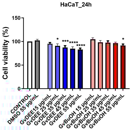 Viability percentage of HaCaT cells after stimulation with GvDEE and GvBuOH extracts at 24 h post-stimulation. Through one-way ANOVA analysis followed by Dunnett’s multiple comparisons post-test, the statistical differences between the control and the treated group (* p < 0.05; *** p < 0.001; **** p < 0.0001) were assessed.