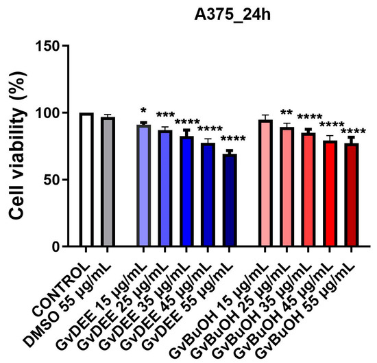 Viability percentage of A375 cells after stimulation with GvDEE and GvBuOH extracts at 24 h post-stimulation. Through one-way ANOVA analysis followed by Dunnett’s multiple comparisons post-test, the statistical differences between the control and the treated group (* p < 0.05; ** p < 0.01; *** p < 0.001; **** p < 0.0001) were assessed.