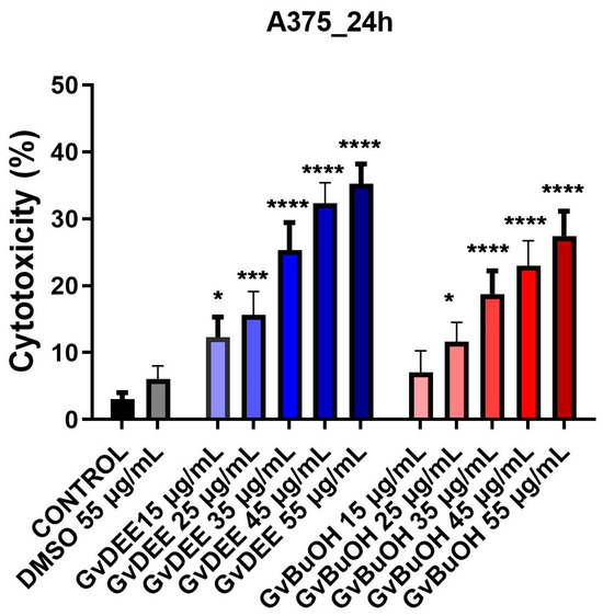 The cytotoxic activity of GvDEE and GvBuOH extracts on the melanoma A375 cell line 24 h post-stimulation. Through one-way ANOVA analysis followed by Dunnett’s multiple comparisons post-test, the statistical differences between the control and the treated group (* p < 0.05; *** p < 0.001; **** p < 0.0001) were evaluated.