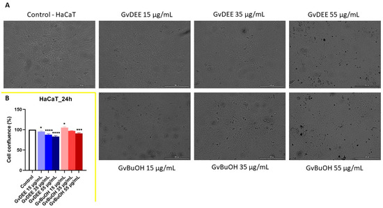 (A) The morphological aspect of HaCaT cells after 24 h of treatment with GvDEE and GvBuOH extracts. The scale bars represent 200 µm. (B) Cellular confluence (%) of HaCaT cell line after 24 h of treatment with GvDEE and GvBuOH extracts. * p < 0.05; *** p < 0.001; **** p < 0.0001.
