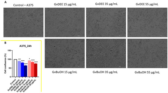 Regarding human melanoma cells, the GvDEE extract showed the strongest decrease in their confluences, with changes regarding the cell’s shape. The cells were shrunken and rounded after treatment with GvDEE extract, leading to their detachment from the plate, even when low concentrations of the extract were used (35 µg/mL), but especially when the cells were treated with the highest concentration (55 µg/mL, to ~65%). The GvBuOH extract induced the reduction in confluence with doses increasing but in a lower percentage (to ~75%) than the GvDEE extract, noting that the cells are stressed, round, and shrunken, as shown in Figure 8A,B.