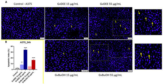 In the case of testing the extracts on the A375 tumor line, the data obtained (Figure 5) showed that both extracts decreased cell viability, with the lowest percentage of viability (69.1%) being observed after exposure to the highest dose of 55 µg/mL of the GvDEE extract for 24 h. In the case of the GvBuOH extract, at the highest concentrations, the cell viability rates were below 80%. Meanwhile, the concentration of 55 µg/mL of DMSO induced an insignificant decrease in the viability of A375 cells. Hence, GvDEE and GvBuOH extracts decreased cell viability in a dose-dependent manner.
