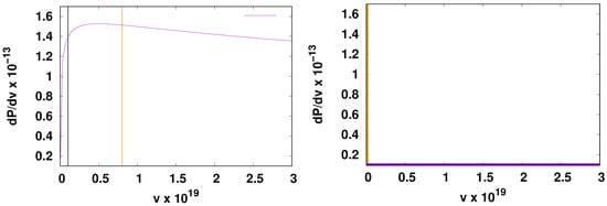 Left panel: An example of the probability distribution of rates v in the new model using . The temperature was taken to be 390 K. The vertical lines indicate two possible values of the parameter . We fix from [23]. In each case illustrated by the vertical lines, the area under the curve between 0 and the line has a value of . The two vertical lines bracket the value , where has a maximum as discussed in the text. Right panel: Probability distribution in our previous model. The peak at in the previous model is actually a delta function at with integrated weight 1 and the horizontal line just above the origin represents the constant probability density allowed for all values of v in the range of (zero excluded). In both panels, only a small portion of the entire range of v, which extends to in both cases, is shown.