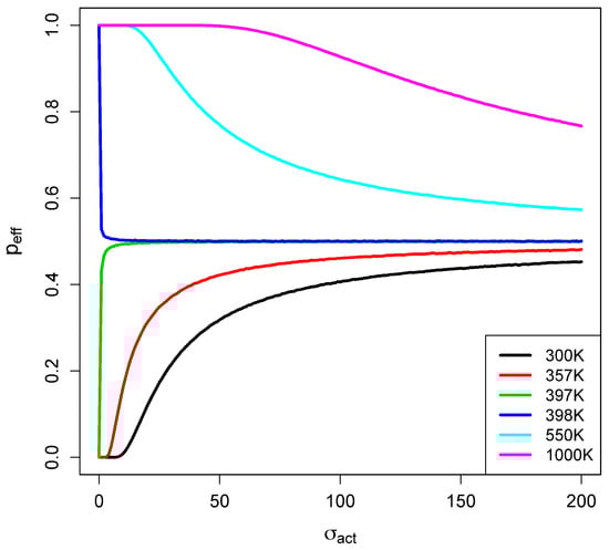 Another key temperature, here termed , describing the equilibrium distributions was defined and discussed in [7]. At the Gibbs limit, in which the term in the denominator of Equation (2) can be ignored, systems in equilibrium at temperature have a flat equilibrium distribution; for , , and at equilibrium with , . is expressed in terms of the model parameters as