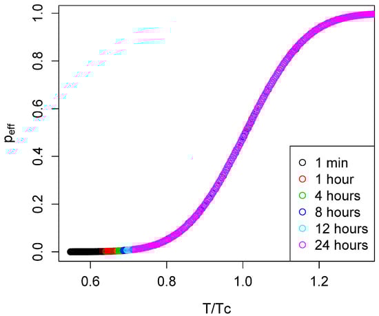 To compare the simulation model with the experimental data reported in [8,9,10,11], we set the before-quench high temperature and the after-quench low temperature to the values reported in these references. was then adjusted so that the simulations gave the best fit to the data. With thus determined, we used (14) to determine with the fixed value of . Finally, using extracted from [23] and Equation (13), we estimated with . In the last step, the estimated was exponentially dependent on , and the value of used was adjusted by about 10% relative to the value reported in [23] in order to bring the estimates of into order-of-magnitude agreement with the experimental reports. The main uncertainties in this procedure arise from our disregard of an appropriate value of (entering in ) and the value of . We found only one carefully reported value [23] for which was for glycine–glycine hydrolysis. The experiments reported in [8] included alanine as well as glycine in the solution and that could contribute to an uncertainty in as well as in .