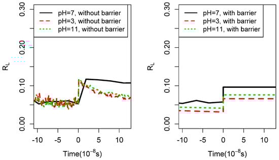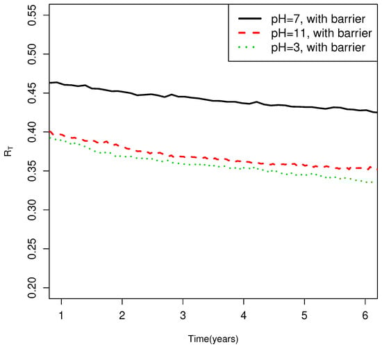 In Figure 5, we display the results of simulations of the disequilibrium measure as a function of real (Gillespie) [31] time for the model without barriers and for the model with barriers for three values of pH. (Other parameters are given in the caption.) One sees a dramatic difference in the time dependence of after quenching: on the short time scales displayed, is not decaying at all in the new model, whereas it is decaying quite rapidly in a pH-dependent manner when barriers are not taken into account. The disequilibrium (more lifelike) state has been stabilized by the presence of barriers. This has been anticipated by others [37]. On longer time scales, up to years, does decay in the new model, but the time scales are much longer, as illustrated in Figure 6. On the other hand, as expected, the system after quenching retains a polymer length distribution close to the one it attained when it was hot, as manifested by a very small change in the parameter as shown in Figure 7.