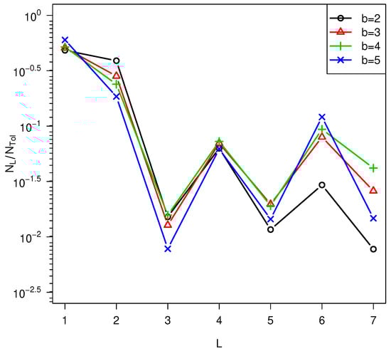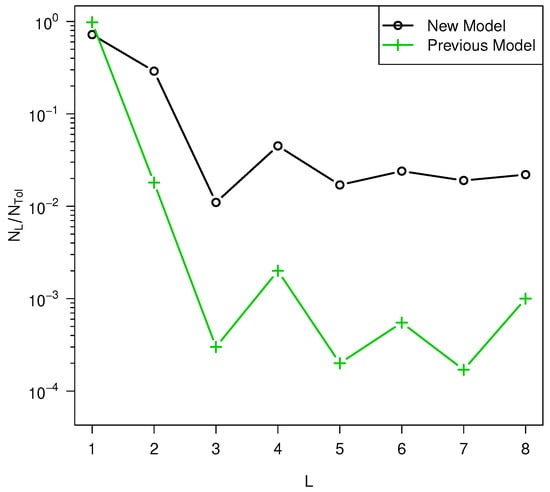 The effects on the polymer length distributions of adding barriers to the model are illustrated in Figure 8. The enhancement in the number of long polymers is significant. In this simulation, the parameter was used. However, as shown in Figure 9, the oscillatory behavior in L persists for larger b values. On the other hand, increasing by increasing or reducing causes the oscillatory behavior to disappear, as shown in Figure 10.