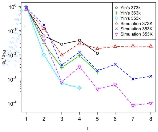 Figure 11 shows fits to the experiments described in [8], and Figure 12 shows fits to the data reported in [9,10,11]. The same values of , , and were used in all the calculations. The oscillations in as a function of L seen in [8] are quite well reproduced by the model and the fits are quite good at the higher initial temperatures. Notably, the orders of magnitude of the ratios are quite well reproduced, whereas they were as much as two orders of magnitude lower using the previous model without barriers.